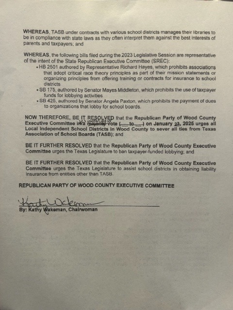 On 1/22/25, Wood County Republicans approved a resolution and sent it to all school district superintendents in Wood County to remind them that they are still responsible for complying with state laws even when their libraries are being managed by TAS contracts.